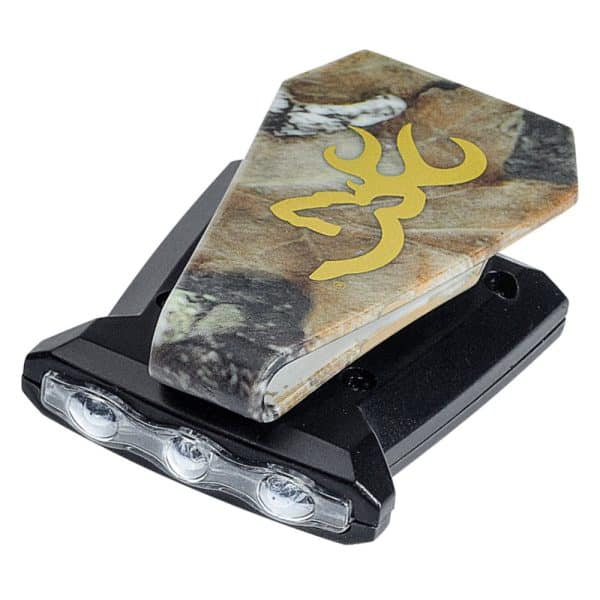 A simple and effective LED light that clips onto the bill of a hat and can be angled up and down. Impact and water resistant. Black body with Vista camo clip.