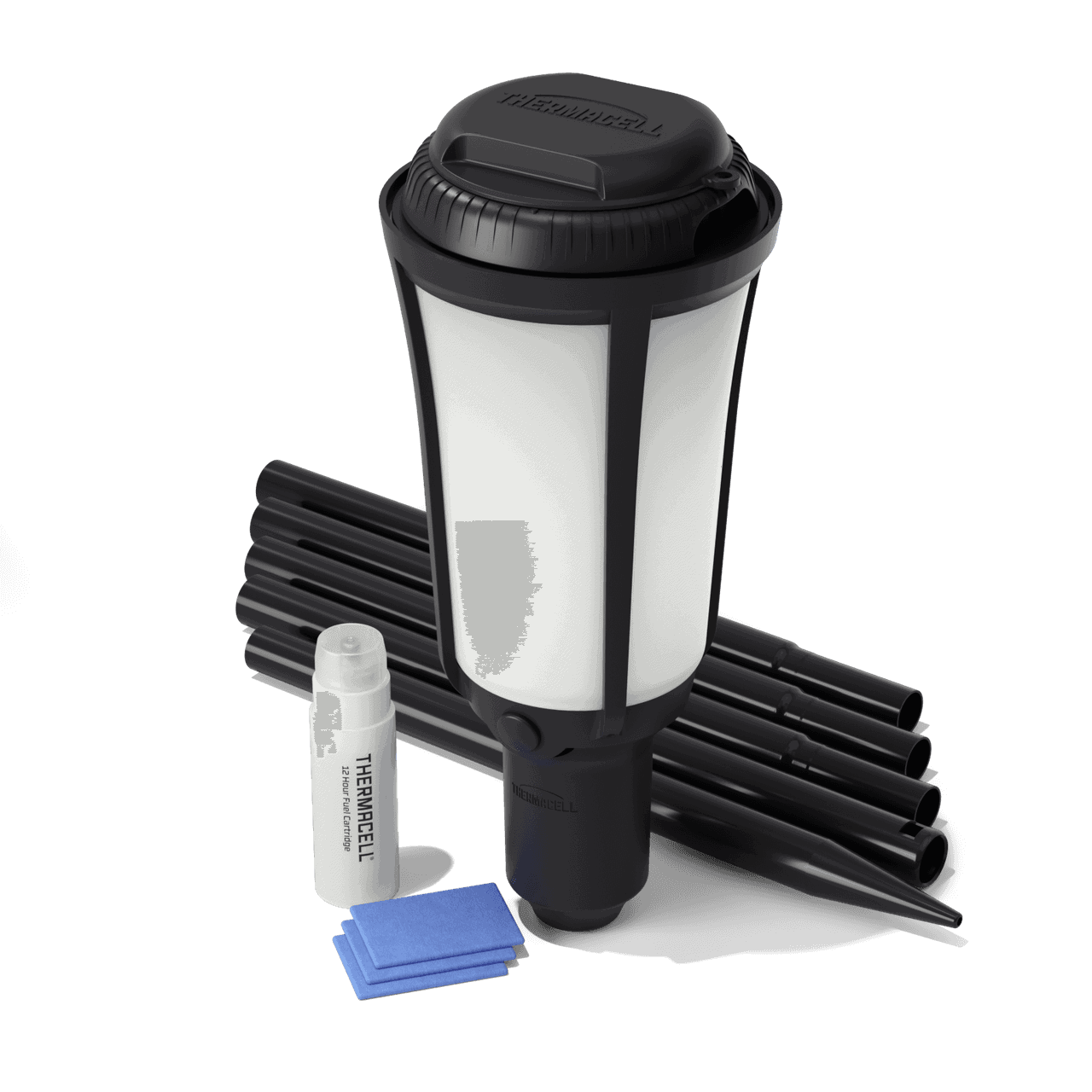 - Package contains 1 reusable LED torch, 5 pole pieces, 1 outdoor cap, and 12 hours of refills – 3 repellent mats and 1 fuel cartridge. Requires 3 AA batteries (not included)